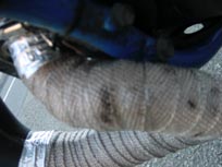 アイドリング中も金属的なたたく音が聞こえる。キャブレターの調子が悪く、混合気が薄いのかと思って家に帰って見るとマフラー(チャンバー)のエキパイ部分に複数穴があいているではないか。